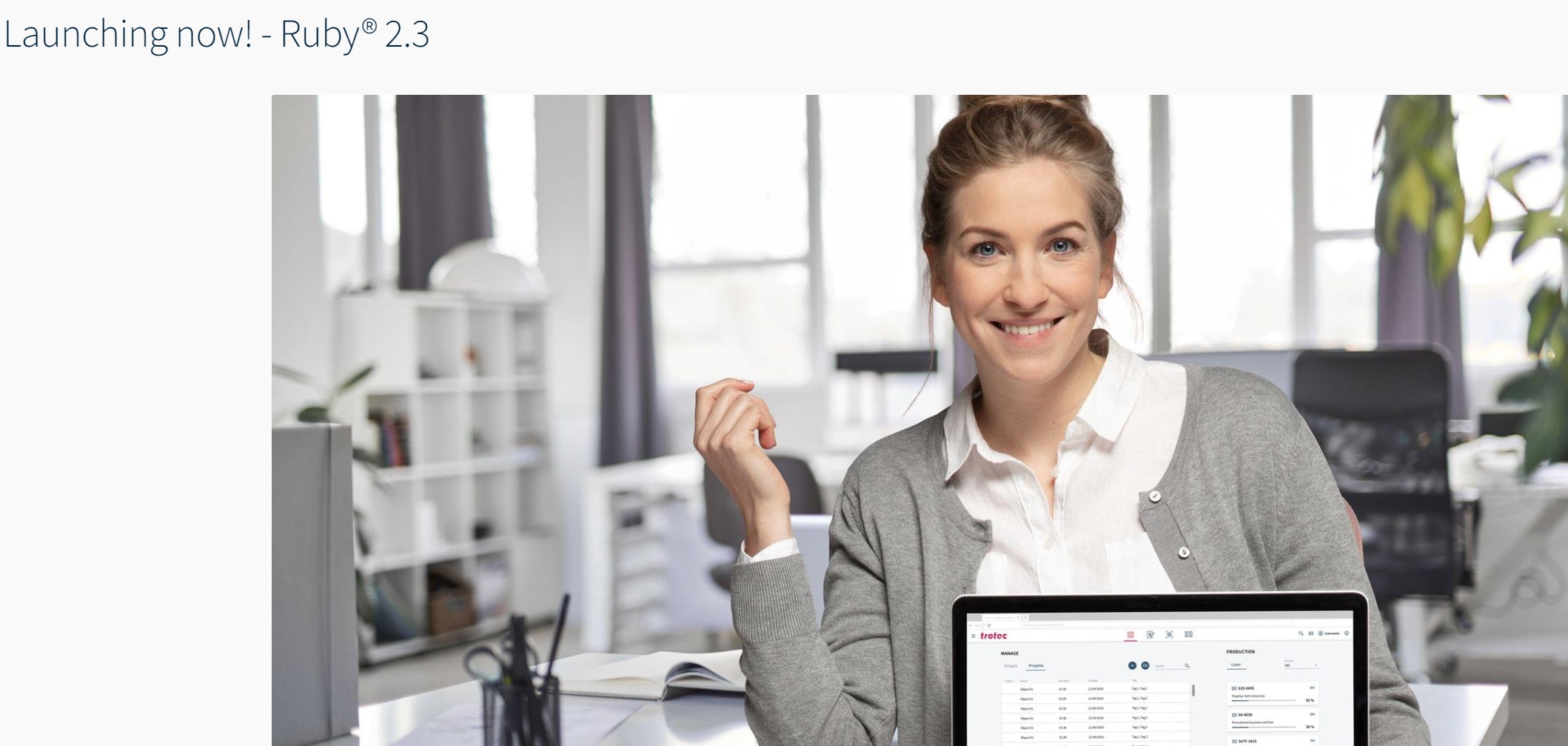 Na začátku roku jsme vám představili novou platformu TROTEC pro lasery – Ruby. Ta nyní přichází s aktualizací 2.3, která obsahuje některé další vylepšené funkce. Jak aktualizaci získat? Je to snadné. Všichni uživatelé automaticky obdrží upozornění přímo v Ruby®. Jediným kliknutím lze Ruby® aktualizovat na nejnovější verzi. Podrobnosti naleznete níže.