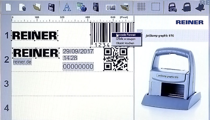 Reiner jetStamp graphic 970 je vlastně ruční inkoustová tiskárna, umožňující značit dokumenty nebo různé výrobky a to snadno a rychle. Se speciální náplní je možné tisknout i na neabsorpční materiály, jako jsou plasty nebo kovy.