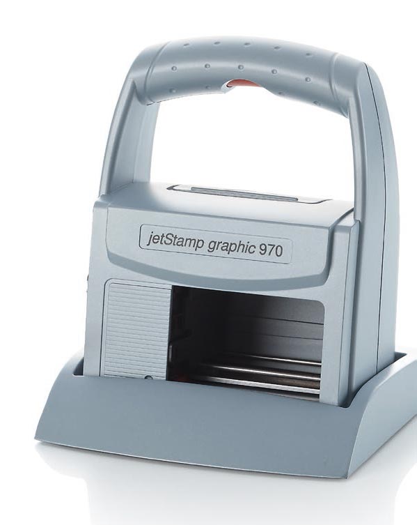 JetStamp graphic 970 je ruční razítko, které jednoduše a rychle potiskne dokumenty nebo výrobky. Navíc k číslu, datu, času a textu, umí také tisknout grafiku a čárové kódy. S rychleschnoucí barvou MP2 nebo novou vylepšenou MP4 je možné ho využít i pro potisk nesavých materiálů, jako jsou kovy, sklo a plasty. Lze ho snadno programovat pomocí softwaru PCset graphic.