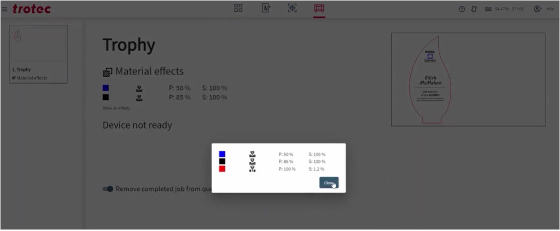 Obsluha laseru může nyní také vidět předdefinované laserové parametry pro zvolený materiál na obrazovce Produce (Výroba).