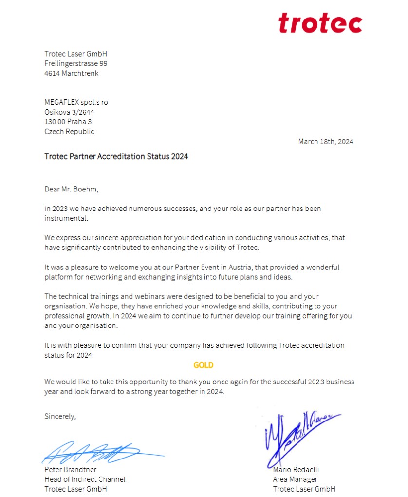 Máme radost, že jsme v Megaflexu za naše úsilí získali toto ocenění. Logo TROTEC Gold nyní bude i součástní našeho specializovaného laserového webu www.megaflex.cz/lasery. Průvodní dopis k udělení statusu TROTEC Gold Partner si můžete přečíst níže.