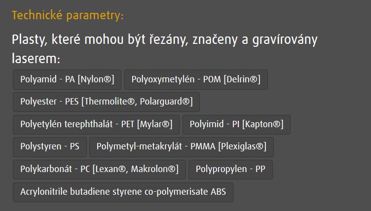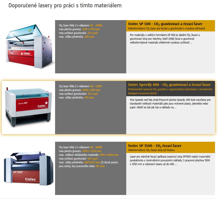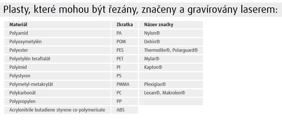 Laserové stroje Trotec, které prodáváme nebo pronajímáme, se používají pro řezání a značení široké škály plastů. Ať už chcete laserem řezat plastové materiály nebo gravírovat polyethylen a silikon – nabízíme vám optimální laserový systém pro vaši aplikaci. Můžete se vrhnout na materály jako jsou PP, PET, PC, PMMA, PS, PES, PA a další.