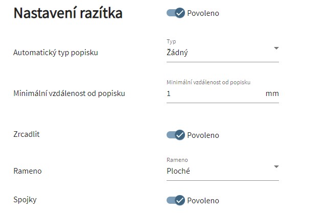 4. Dále jděte na Nastavení razítka. Zde vyberte možnosti pro razítka dle obrázku níže. Pro Rameno (úkos) máte tři známe možnosti (flat/plochý, medium/střední, steep/strmý). Aktivaci spojek zvolte dle vašich požadavků.