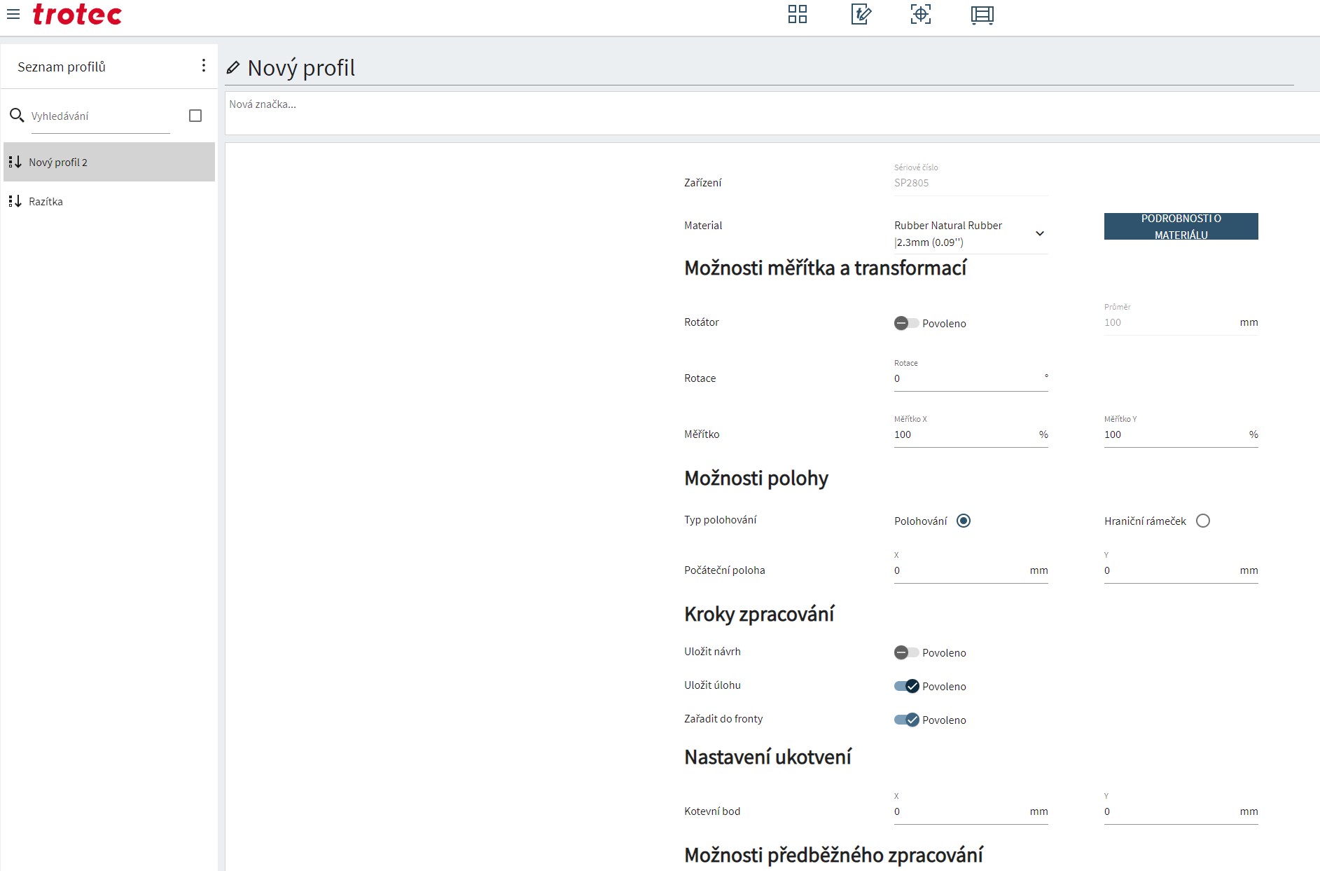V softwaru Ruby si můžete jednoduše vytvořit profily pro často se opakující úlohy. Je možné si definovat a uložit nastavení pro daný materiál, parametry, polohu, měřítko, rotaci a případně pro použití rotačního gravírování.