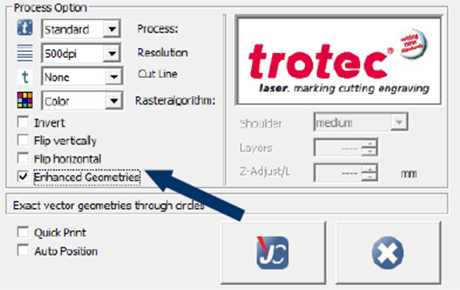 Poté se v tiskovém ovladači zaškrtne políčko “Enhanced Geometries“