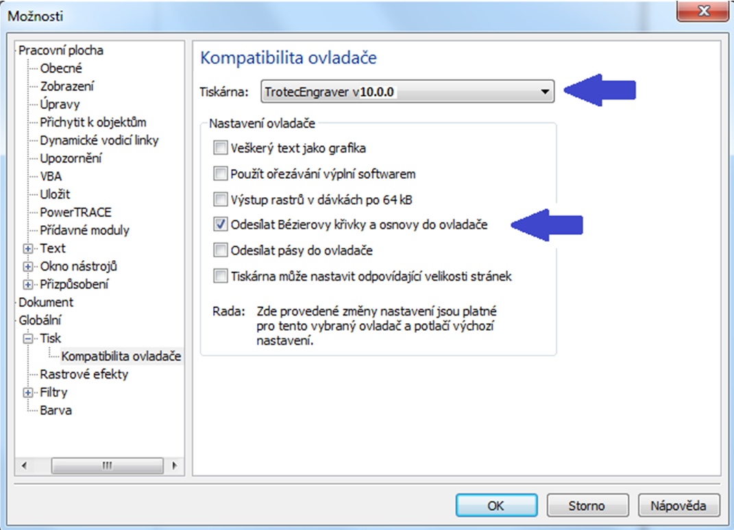 V CorelDRAW otevřete Nástroje – Možnosti – Globální – Tisk – Kompatibilita ovladače a objeví se následující okno s nastavením: