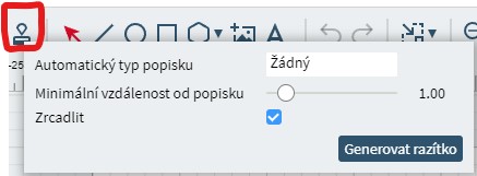 Stisknutím tlačítka „Generovat razítko“ (viz obrázek) v okně Návrh se daná grafika otočí a je poté vhodná pro vytvoření razítkového štočku. V seznamu návrhů se vytvoří automaticky nový návrh. Můžete nastavit i automatickou ořezovou čáru, pokud ale máte vytvořený svůj ořez, tak čáru nenastavujte. Dále je možné nastavit minimální vzdálenost od ořezové čáry (doporučujeme nejméně 1 mm) a zrcadlení grafiky. Ořezovou čáru pro typ úlohy Razítko musíte vždy vytvořit, aby laser věděl, jakou plochu má odgravírovat.