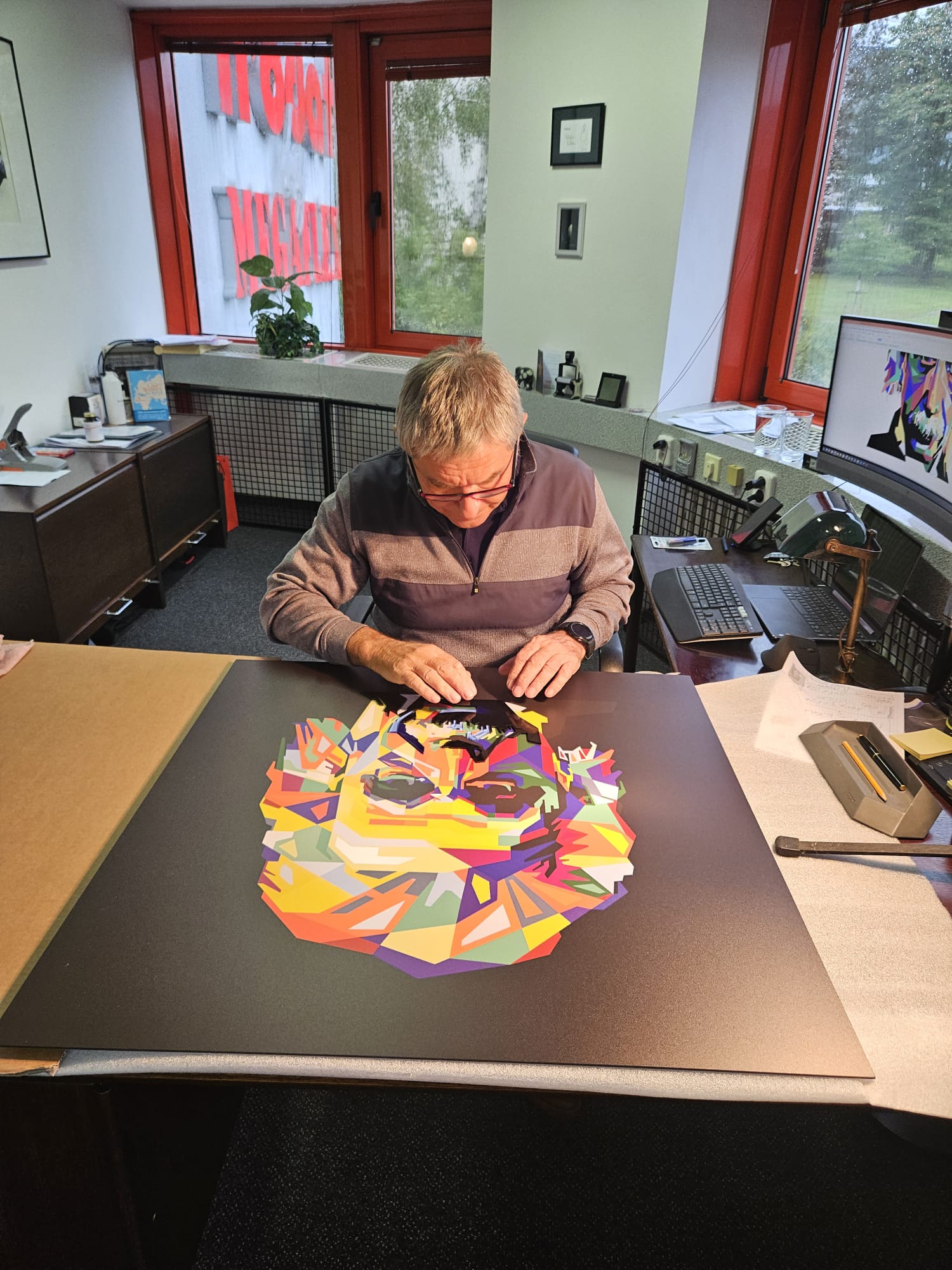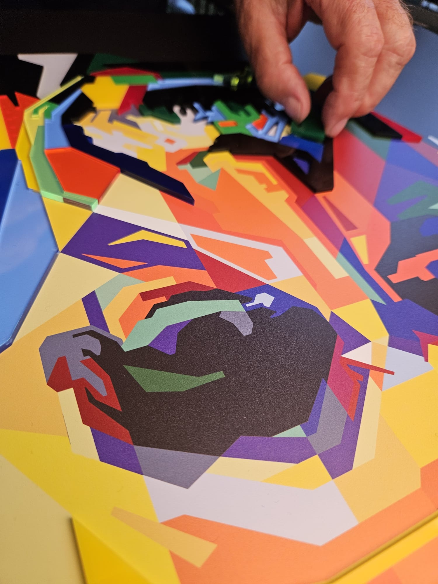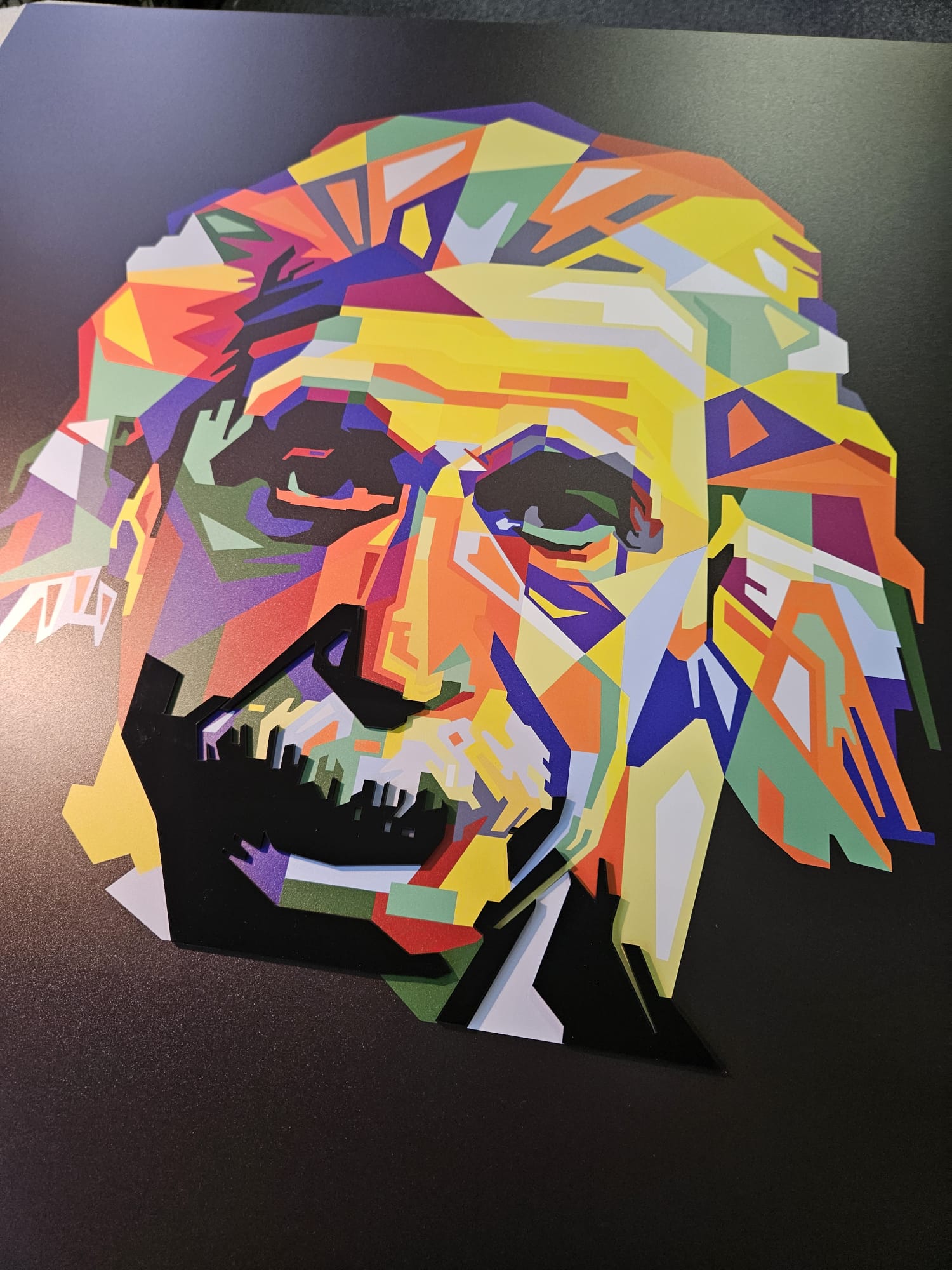Stejně jako minule jsme graficky upravenou fotku Einsteinovy hlavy převedli do jedenadvaceti barevných odstínů, které mají desky TroGlass Color Gloss, vyřezali je na laseru a složili jako puzzle. Měli jsme již trochu představu, kolik času si vyhradit a jaký nejlepší postup zvolit, takže nám to šlo od ruky ještě lépe.