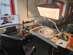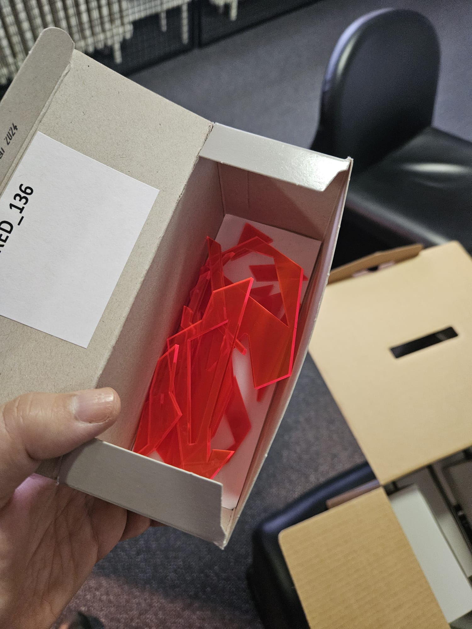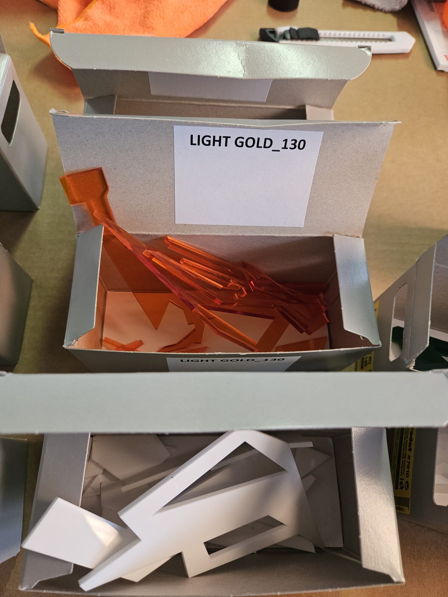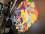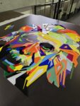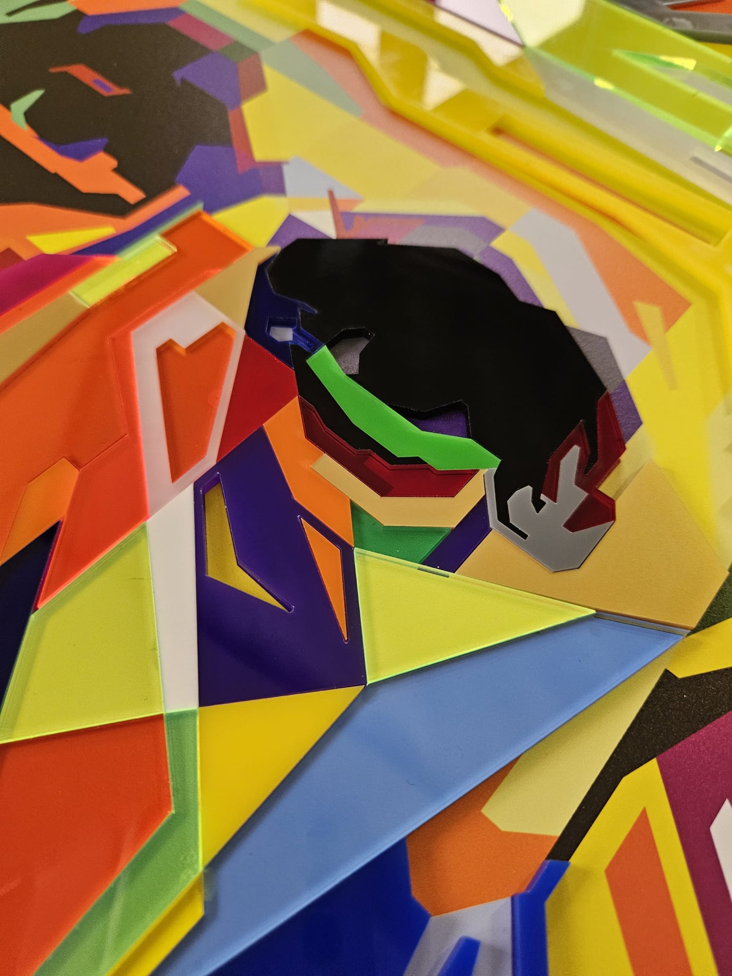 Stejně jako minule jsme graficky upravenou fotku Einsteinovy hlavy převedli do jedenadvaceti barevných odstínů, které mají desky TroGlass Color Gloss, vyřezali je na laseru a složili jako puzzle. Měli jsme již trochu představu, kolik času si vyhradit a jaký nejlepší postup zvolit, takže nám to šlo od ruky ještě lépe.