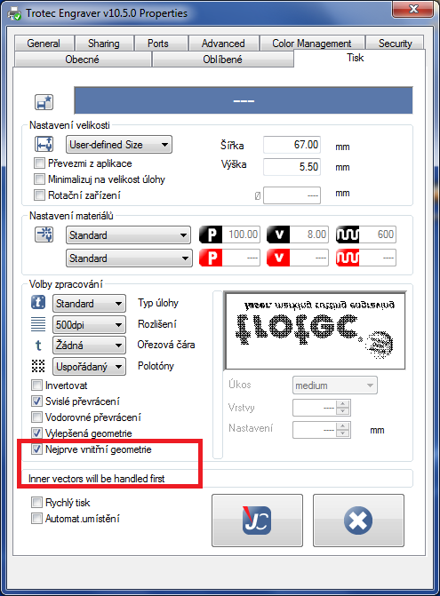 – Přiřaďte řezacím čarám různé barvy dle barev v databázi materiálů Trotec. Řezací čáry jsou poté řezány podle pořadí barev v databázi materiálů. Bravy jsou v RGB kódu a tloušťka čar musí být zachovány 0,001 mm.