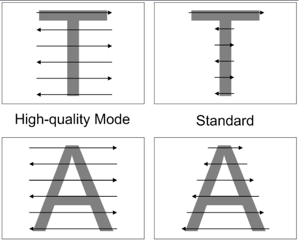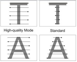 V režimu vysoké kvality se laser po celé šířce úlohy pohybuje se stejnou rychlostí, přičemž vypaluje pouze vymezené oblasti pro gravírování. To znamená, že úlohy jsou gravírovány se stejnou rychlostí po celé ploše. Výsledkem je velmi rovnoměrné a homogenní laserové gravírování.
