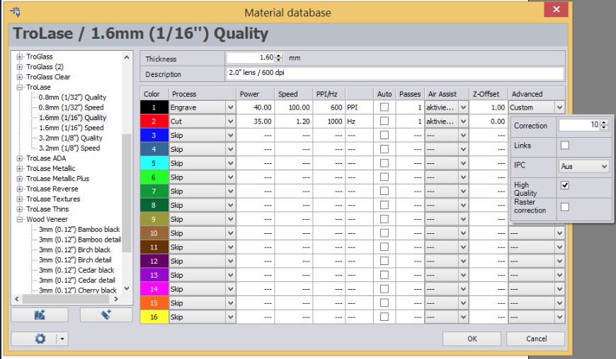 - Otevřete databázi materiálů v laserovém softwaru JobControl®