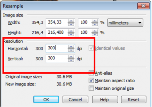 Obecně by obrázky pro laserové gravírování měly mít rozlišení nejméně 300 dpi. Pokud je to nutné, můžete zvětšit rozlišení ve vašem grafickém programu pomocí převzorkování (resampling). Například v CorelDRAW je to funkce: Rastry – Převzorkovat.