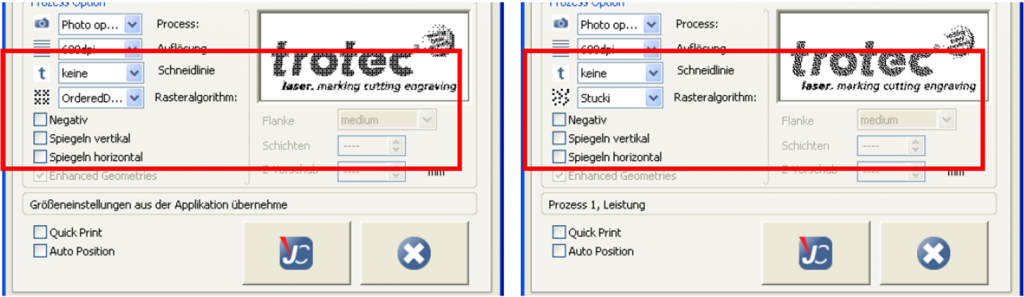 Obě metody jsou implementovány v tiskovém ovladači JobControlu X. Navíc je zde i nový „Typ úlohy“ optimalizace fotografie (Photo optimized). Pomocí tohoto procesu je obrázek pro laser automaticky přenesen do JobControlu X pomocí inteligentního algoritmu. Můžete proto získat vždy dobré výsledky pro gravírování fotografií.