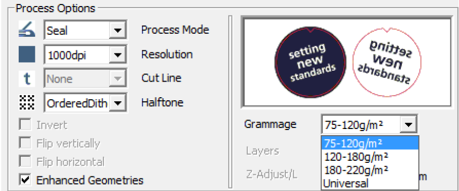 JobControl 10.3 přináší nový typ zpracování úlohy v tiskovém ovladači. Typ úlohy „Reliéfní razítko“ automaticky vytváří matrici a patrici – včetně ořezových čar – pro vnější obrys a trojúhelníkovou prohlubeň („nos“), která slouží k usnadnění správného umístění obou raznic (matrice a patrice) tak, aby do sebe správně zapadaly.