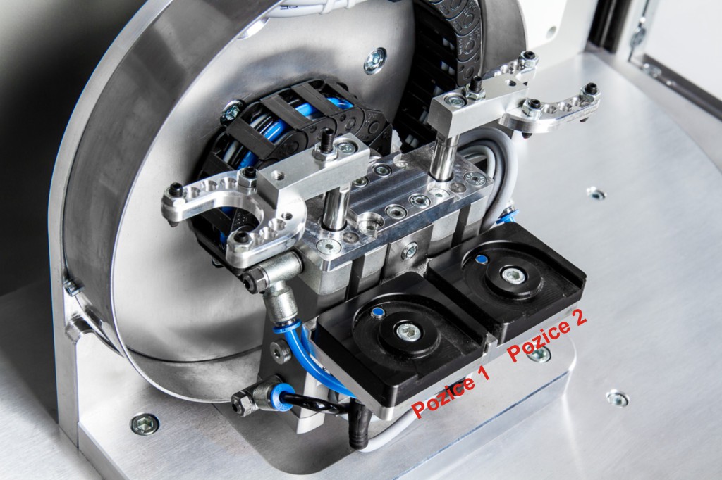 Dvoupozicová pneumatická rotační jednotka: efektivně využívá maximálního rozsahu pracovního pole optiky, které činí 110x110mm. Je navržená pro upevnění dvou cívek vedle sebe (pozice 1 a pozice2). Laser nejprve od-gravíruje vrstvu laku z horní části cívek a následně po přeostření (viz. elektrická osa Z) od-gravíruje spodní části. Po té, co laser dokončí práci na pozicích 1 a 2 se jednotka otočí o 180° a celý proces se zopakuje.