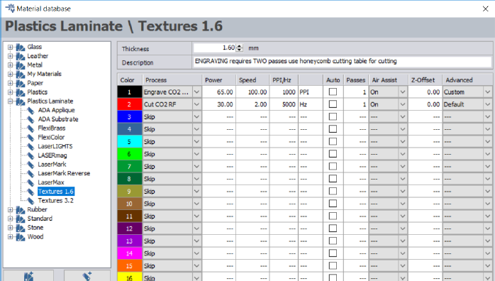 - Plná možnost kvalitního doladění parametrů pro gravírování (faktor K, přesahy, laserová korekce)