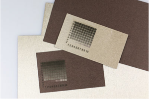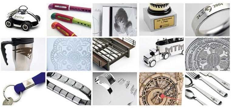 Dřevo, Papír, Kůže, Akrylát, Sklo, Textil, Eloxovaný hliník, Kámen, Plasty, Dvouvrstvé plasty (Rowmark, TroLase)