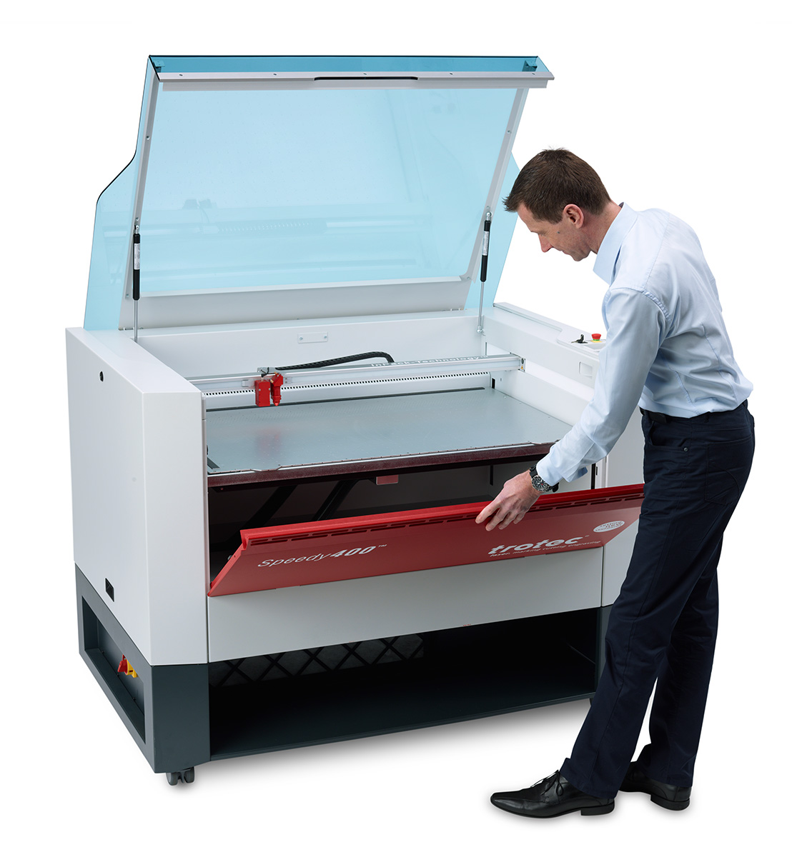 Speedy 400 nemá přední panel, což umožňuje bezbariérový přístup k celé pracovní ploše. Vkládání velkých deskových materiálů nebo i příslušenství, jako je rotační zařízení či jiný typ pracovního stolu, je tak významně zjednodušeno. Nová konstrukce snižuje také potřebnou fyzickou sílu na minimum dokonce i tehdy, pokud je potřeba vkládat velké kusy materiálu. Speciální konstrukce víka poskytuje vždy úplný pohled do pracovního prostoru laseru, a to i při zavřeném stroji. To všechno nabízí větší komfort a šetří obsluze čas… a tedy i peníze.