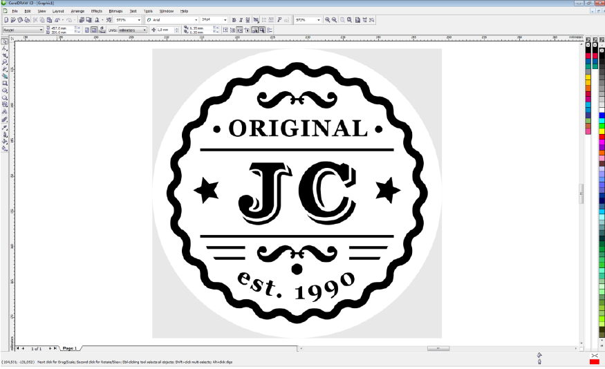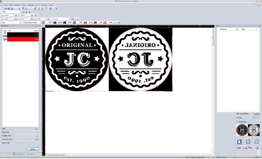 V našem příkladu je grafika vytvořena v programu CorelDRAW. Mohou být použity i jiné grafické programy, jako je například Adobe Illustrator, Freehand atd. Důležité je, že nemusíte vytvářet ořezovou čáru ani trojúhelníkovou prohlubeň („nos“). JobControl to udělá za vás. Tiskový ovladač vytvoří ořezovou čáru podle vybrané velikosti reliéfního razítka. Pokud například budete používat průměr 41mm, ale vaše grafika bude velká 34mm, tak tiskový ovladač vytvoří ořezovou čáru o průměru 41 mm, aniž by se změnila velikost grafického návrhu. Vy se zaměřte na váš grafický návrh uvnitř ořezové čáry. JobControl X také automaticky zvětší objekty na matrici podle zvolené gramáže papíru v tiskovém ovladači. Tiskový ovladač také nabízí předdefinované velikosti standardních reliéfních razítek, které jsou na trhu.