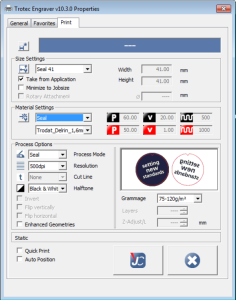 Gravírování: výkon = 100%, rychlost = 20%, dpi/PPI = 500
