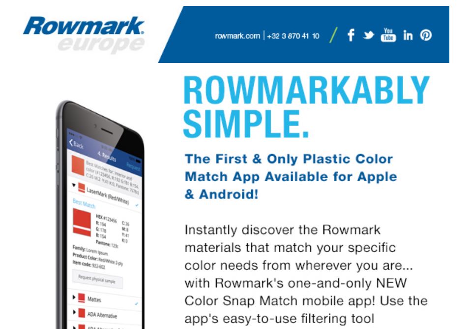 Firma Rowmark přišla se zajímavou aplikací, kterou si zdarma během pár vteřin můžete stáhnout do vašeho telefonu. Jmenuje se Color Snap Match. Stačí do vyhledavače v Google play či App Store zadat slovo Rowmark nebo Color Snap Match a aplikace se vám nabídne ke stažení. Tato šikovná pomůcka vám i vašim zákazníkům umožní jednoduše – pomocí vámi pořízené fotografie – zjistit, jakou barvu a typ materiálu pro zakázku nejlépe zvolit a jednoduše jej u nás objednat.