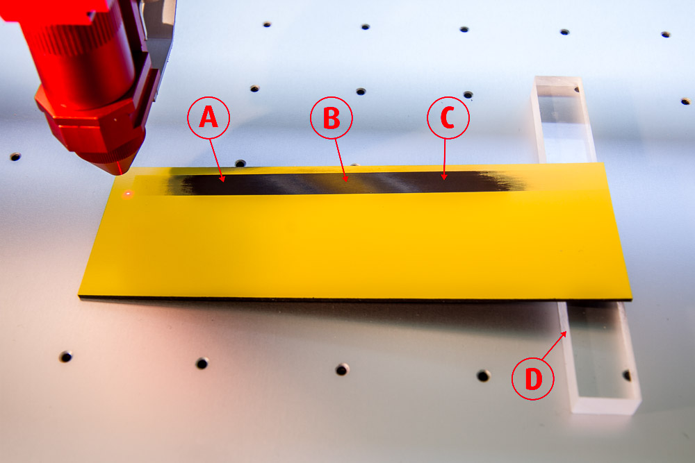 3. Zaostření laseru – správnou vzdálenost mezi gravírovaným materiálem a laserovou čočkou snadno zjistíte tak, že ho na jedné straně podložíte o cca. 5 mm (D). Pomocí měrky zaostřete na střed materiálu (B) a nechte vygravírovat obdélník 100 x 10 mm. Po dokončení se podívejte, kde je jádro nejčernější (A) (B), zjistěte o kolik je laser rozostřený a o zjištěnou hodnotu vždy zaostření upravte. U laserů Trotec můžete hodnotu rozostření zadat do tabulky „Nastavení materiálů“ do kolonky „Z-ofset“. Laser automaticky před zahájením gravírování o uvedenou hodnotu vzdálenost v ose Z upraví a po dokončení gravírování zase vrátí na původní výšku.