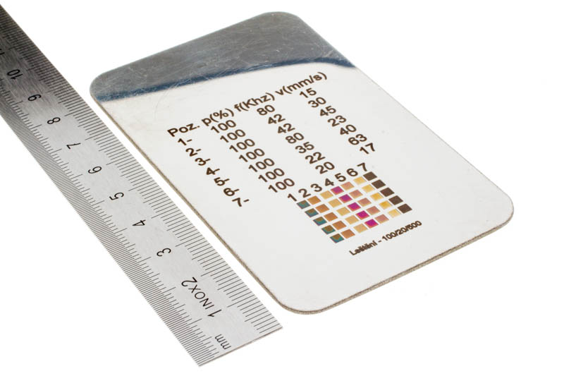Barevného značení do nerezu můžeme docílit různým nastavením parametrů laseru (výkon, rychlost, frekvenci) v kombinaci s de-fokusací (viz tabulka+obrázek). Byla použita čočka 160mm a konstantní de-fokus +8 mm.