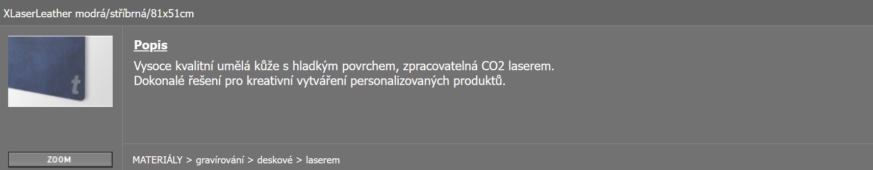 Dosud jsme LaserLeather nabízeli v šesti různých barevných kombinacích. Nyní nabídku rozšiřujeme ještě o následující 2 barvy navíc. Můžete tedy v našem eshopu v sekci materiály nyní objednávat i šedostříbrnou a modrostříbrnou. Stačí do vyhledavání zadat heslo „leather“ a zobrazí se vám kompletní nabídka včetně následujících dvou nových odstínů.