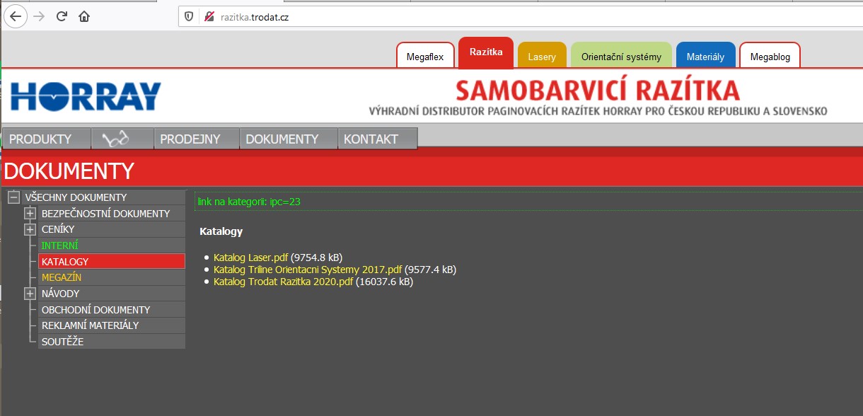 Možná se občas potřebujete rychle podívat do katalogu razítek, laserů nebo materiálů a orientačních systémů a někam jste jej založili. Nemáte ho po ruce v tištěné podobě a potřebujete najít informace o zboží, vyhledat typ, model, konkrétní informaci. Jste na cestách nebo mimo kancelář? Pak jiste oceníte naši záložku dokumenty.