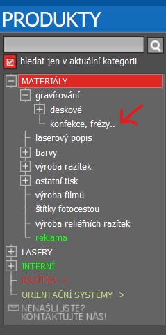 Pečetě, dveřní štítky nebo psí známky a další příslušenství pro gravírování najdete pod záložkou materiály v produktech, oddílu gravírování/konfekce, frézy.