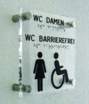 Připravili jsme pro vás standardní tabulky, které vyhoví vyhlášce (odst. 5.2): „...Dveře musí mít na vnější straně ve výši 200 mm nad klikou umístěn štítek s hmatným orientačním znakem a s příslušným nápisem v Braillově písmu jako je text „WC ženy“, „sprchy muži“ nebo „šatny ženy“. Braillovo písmo musí mít parametry standardní sazby.“