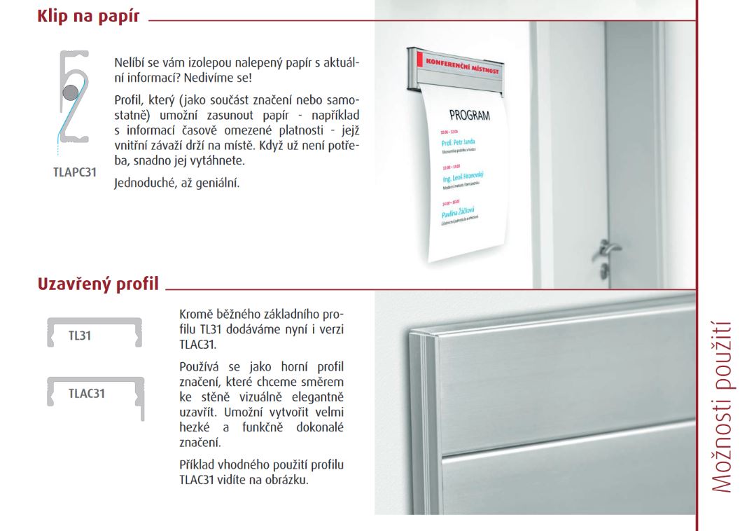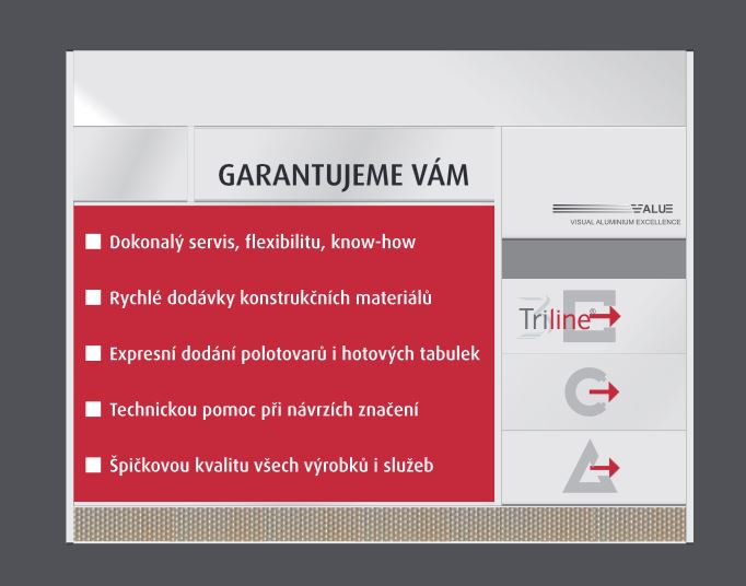 Celý systém TRILINE svou variabilitou dnes již přesahuje běžnou představu o orientačních systémech a nabízí i technicky dokonalá řešení pro výstavní a informační panely, včetně moderních prosvětlených, s rychloupínacími patentovanými profily.