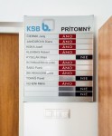 Druhá fotografie ukazuje velmi zajímavé využití bočního profilu Classic. Na ceduli si klient může hned přečíst, kdo je přítomen. Systém funguje tak, že se text ANO/NE překryje posuvnou stříbrou deskou (Rowmark Lasermax), aby byl vidět jen aktuální stav.