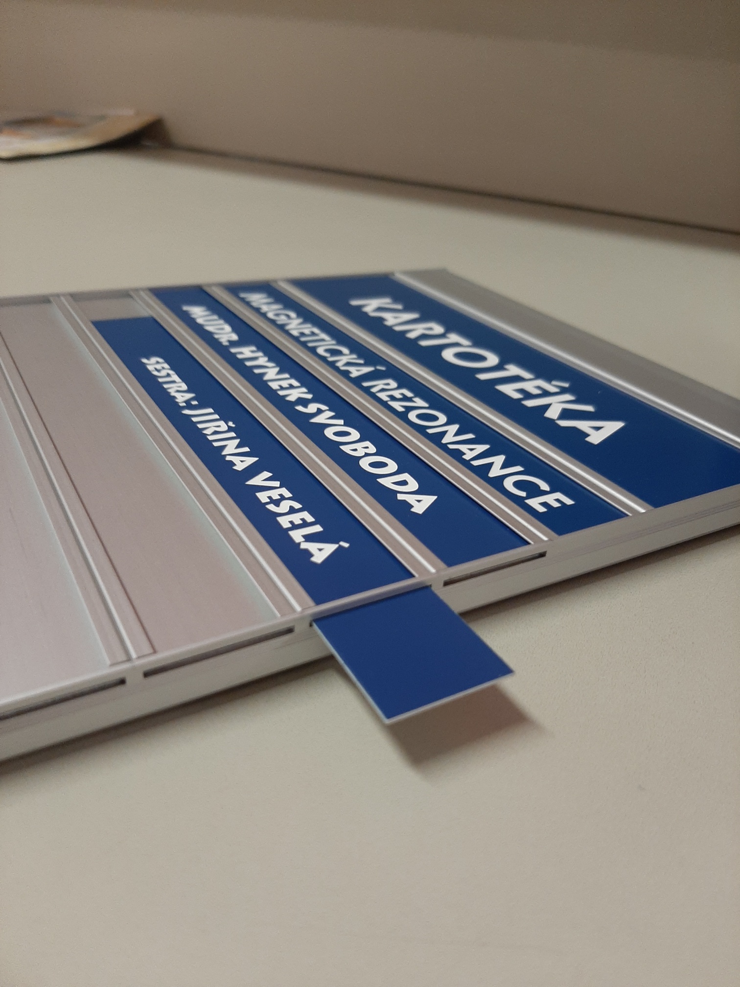 Můžete nemocnicím dodat: výstrčky, stojánky, závěsné značení, velké vstupní tabule, menší patrové tabule, dveřní tabulky s možností výměny jmenovek, A4 /A5 tabulky s možností výměnné informace + venkovní značení.