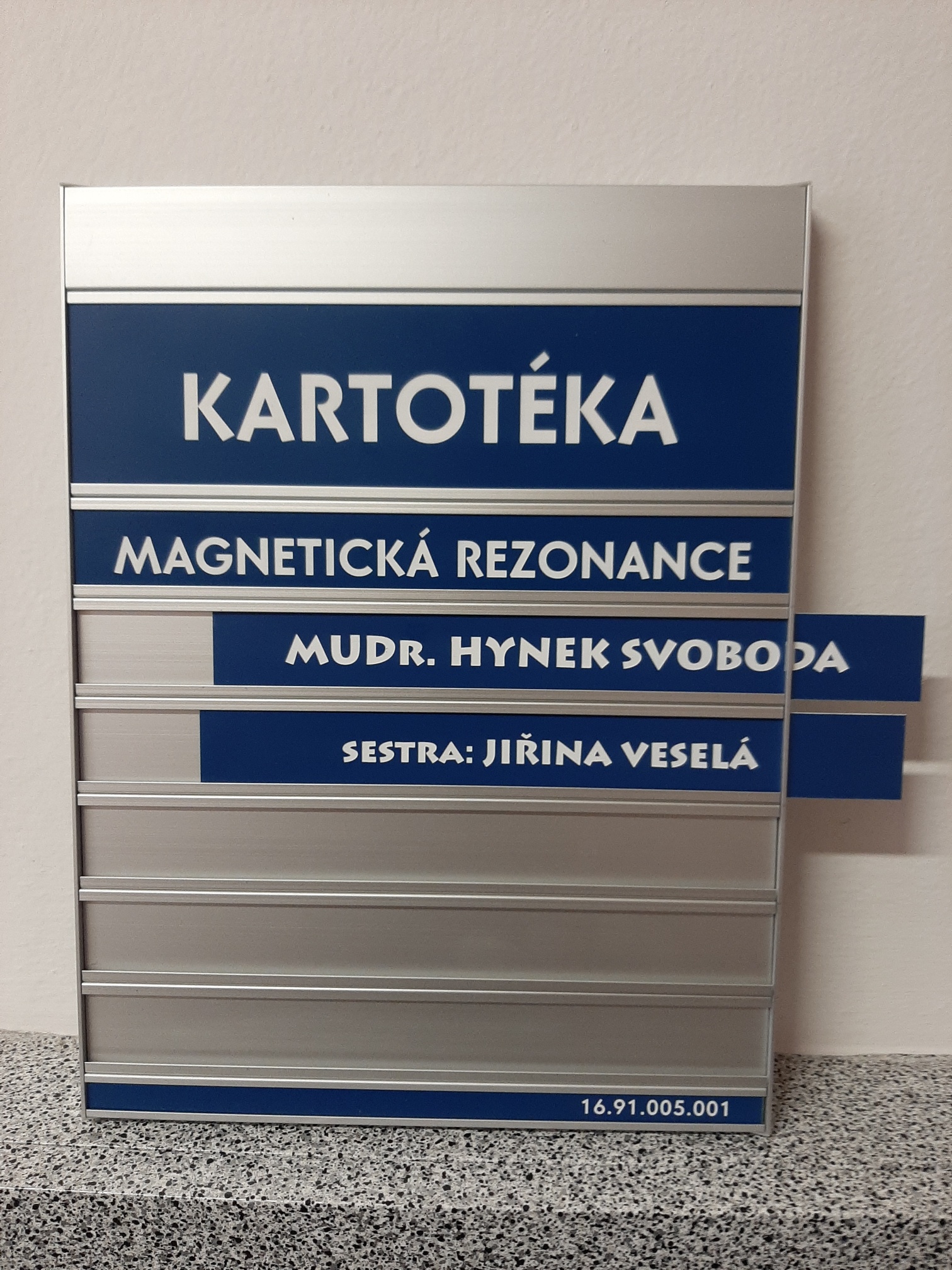 Můžete nemocnicím dodat: výstrčky, stojánky, závěsné značení, velké vstupní tabule, menší patrové tabule, dveřní tabulky s možností výměny jmenovek, A4 /A5 tabulky s možností výměnné informace + venkovní značení.