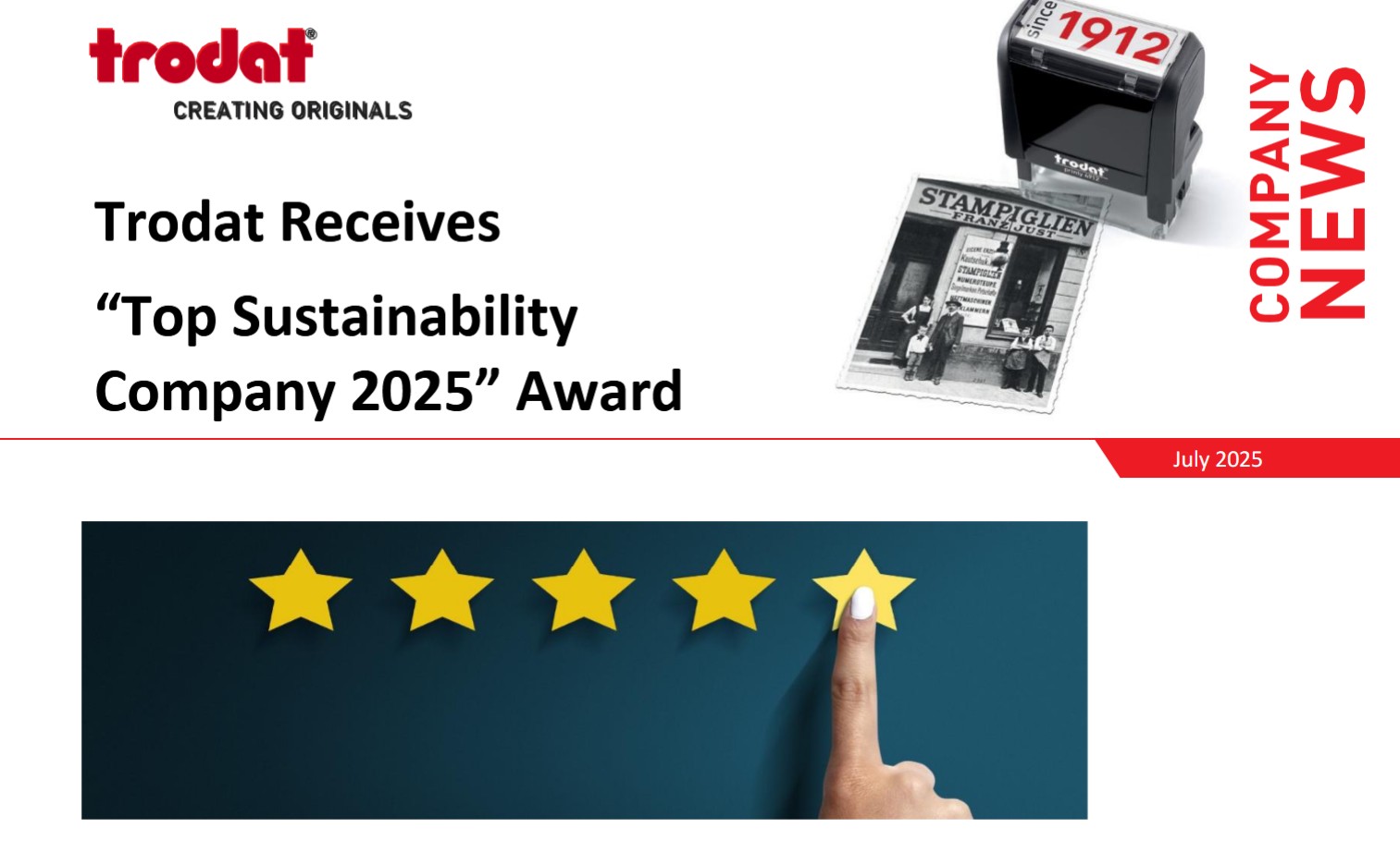 Náš dodavatel razítek – firma TRODAT, opět dokázala, že patří mezi absolutní špičku. Od renomovaného německého F.A.Z. Institutu získala ocenění „Top Sustainability Company 2025“ a řadí se tak mezi nejlepší udržitelné společnosti roku 2025. F.A.Z. Institut je jedna z nejuznávanějších… Zobrazit více ›