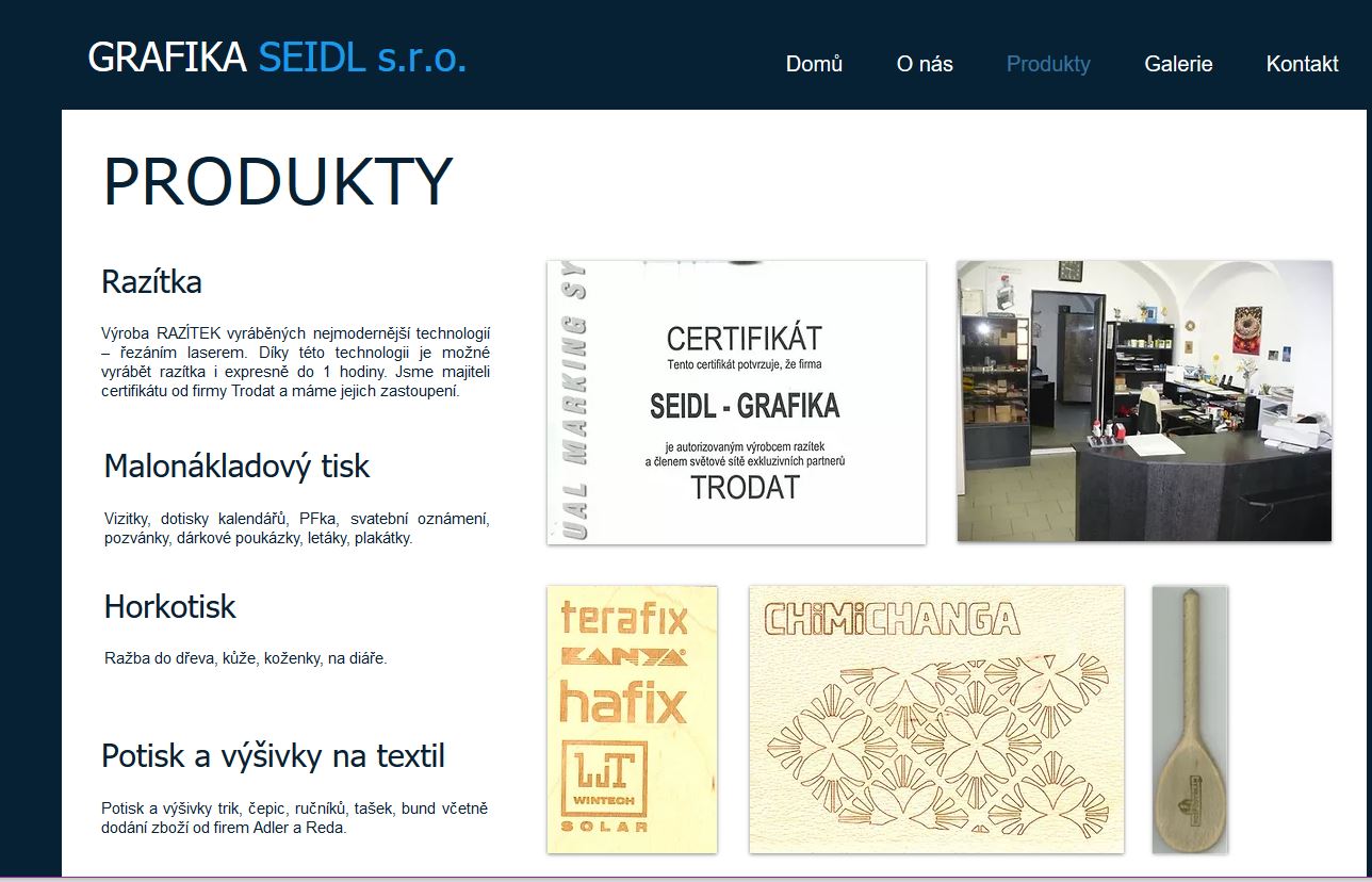 Naše firma funguje už od prosince roku 1990, na živnostenský list od března 1991, od roku 1991 jako firma Josef Seidl a od roku 2005 jako GRAFIKA SEIDL s.r.o dodnes. Začínali jsme s výrobou razítek a postupně jsme naše služby rozšířili i na malonákladový tisk, tamponový tisk, sítotisk, laserování, prodej tamponovacích strojů a příslušenství. Firma začínala v malých prostorech na ulici Boženy Němcové, dnes máme dílnu pro potisky v areálu firmy Dukor na Trstěnické ulici.
