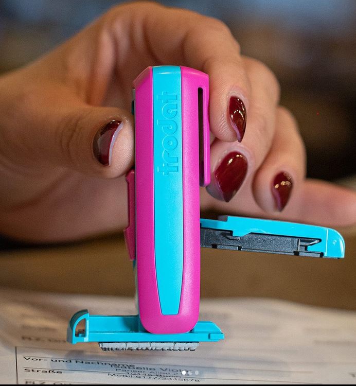 Sada s razítkem Stamp And Stick umožňuje vysázet jakýkoliv text (nejčastěji se používá jméno v kombinaci s veselou ikonou) a pak označit všechny předměty, které chcete – tedy například papíry, knihy, učebnice, boty, textil, hladké povrchy, nažehlovací pásky a tak dále.