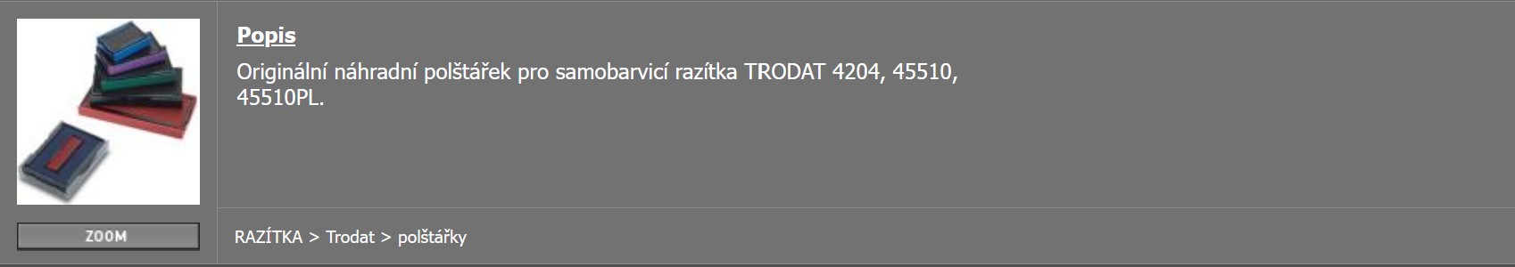 Trodat končí s nabídkou polštářků 6/4710 a také 6/4204 do razítek 4204, 45510 a 45510PL, která se již více než 10 let nevyrábějí. Doposud byly náhradní polštářky v prodeji kvůli možným výměnám. Nyní je ale výroba ukončena a po doprodání našich skladových zásob polštářky již nebude možné zakoupit.