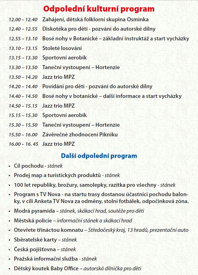 Můžete se s Klubem také vydat na jednu z připravených pěších tras. Starty budou od 8 – 11 hod. Z naší dlouholeté spolupráce s Klubem českých turistů víme, že se jedná o velice příjemnou akci, kterou můžeme doporučit. Vezměte děti, přátele příbuzné a užjite si krásný den.