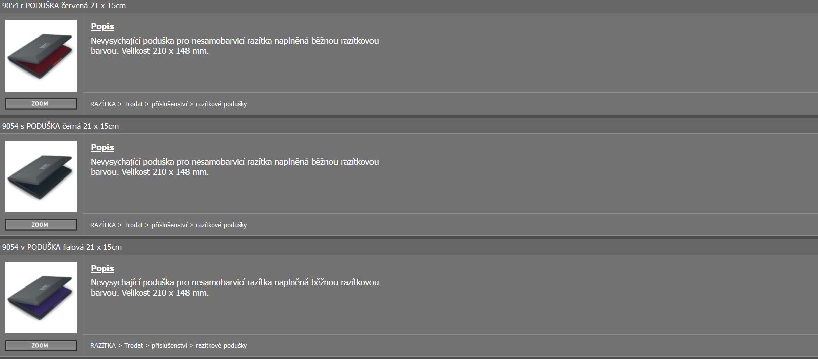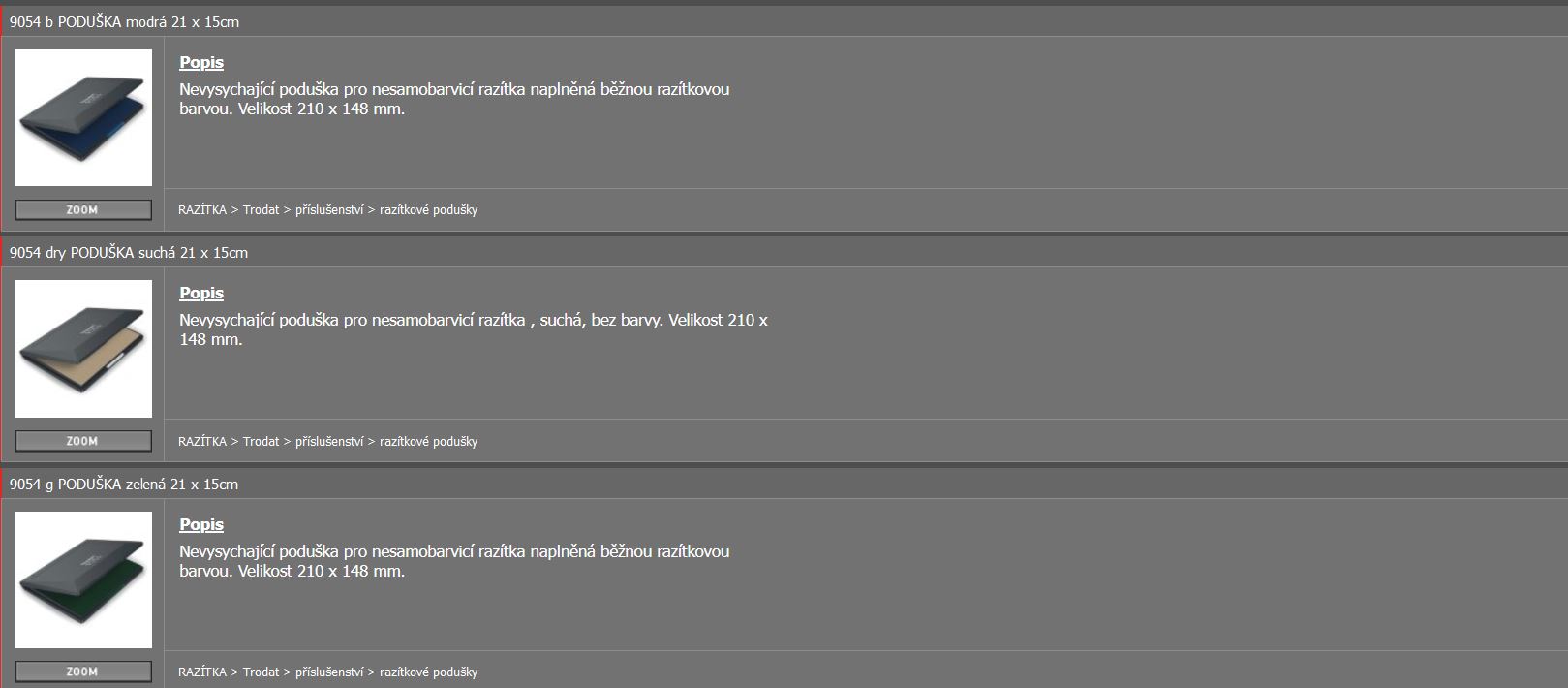 Poduška 9054 je určena pro nesamobarvicí razítka a je standardně naplněna razítkovou barvou. V našem e-shopu ji najdete v 6ti dostupných variantách – tedy modré, zelené, červené, černé a fialové plus ještě navíc v suché verzi.