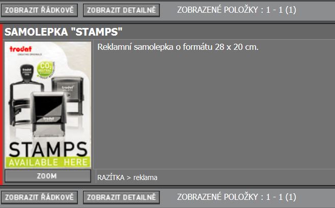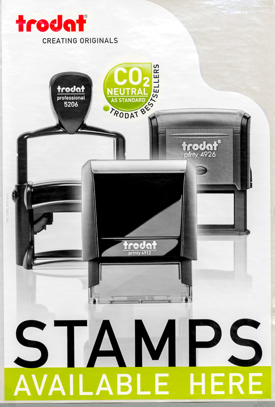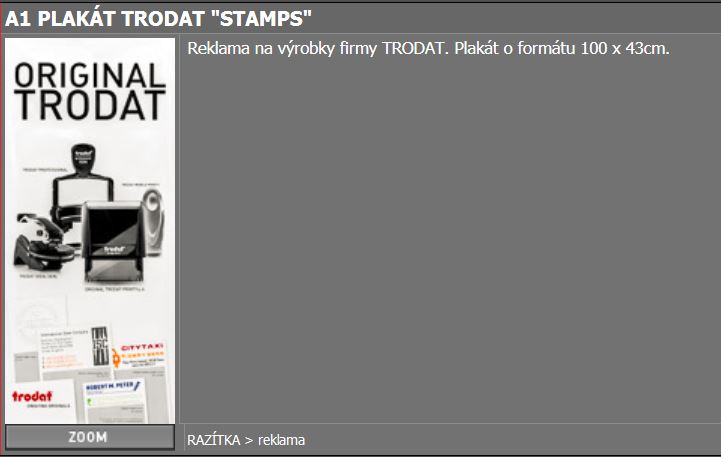 Rozšířili jsme naši nabídku reklamních produktů TRODAT o další dva: Plakát propagující rodinu razítek TRODAT a novou samolepku „STAMPS AVAILABLE HERE“ (Razítka k dostání zde). Přidejte si je k objednávce už dnes a ozdobte si vaši prodejnu, dveře, výkladní skříň, prodejní regál. Jako naši partneři je máte zdarma.