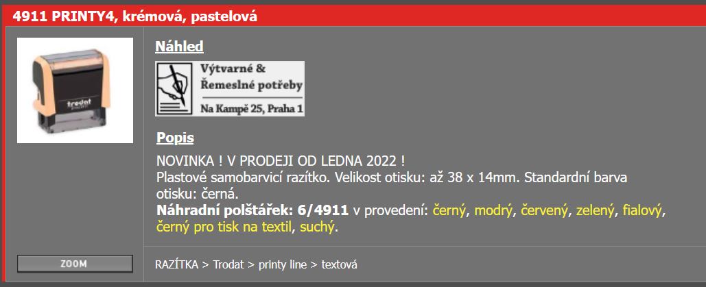 Jsou to plastová samobarvicí razítka s velikostí otisku 38x14mm (4911), 47x18mm (4912) a 58x22mm (4913). Standardní barva otisku: černá. Náhradní polštářek: 6/4911, 6/4912 a 6/4913 v provedení: černý, modrý, červený, zelený, fialový nebo suchý.