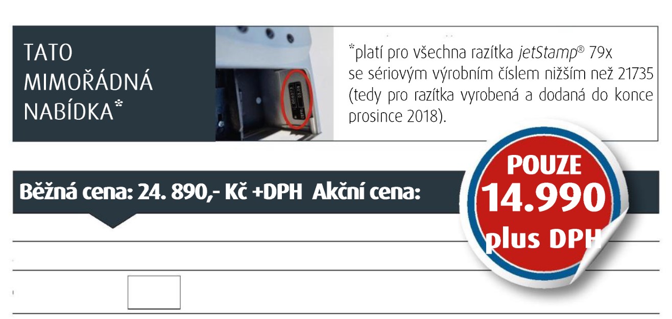 Tato mimořádná nabídka platí pro všechna razítka jetStamp® 79x se sériovým výrobním číslem nižším než 21735 (tedy pro razítka vyrobená a dodaná do konce prosince 2018).