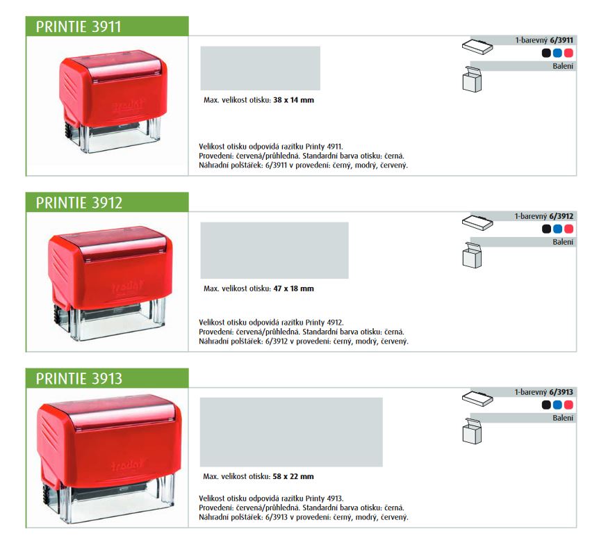 V naší nabídce najdete PRINTIE ve 3 variantách velikosti otisku. Každé z nich je možné v našem katalogu najít i ve verzi bez polštářku. Barva razítka je pouze červená.