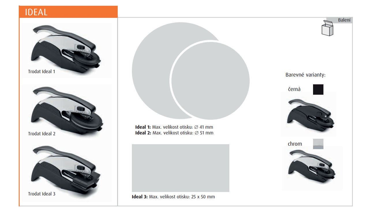 Reliéfní razítko Trodat Ideal umožňuje velmi dobré otisky s mnoha grafickými detaily. Laserová výroba tiskových štočků (matrice i patrice) garantuje přesný přenos návrhu na papír. Díky malému zdvihu razítka dosáhne i člověk s menší rukou dokonalého otisku. V každém reliéfním razítku Trodat IDEAL můžete využívat i několika textových desek. Jejich výměna je intuitivní a velmi snadná.