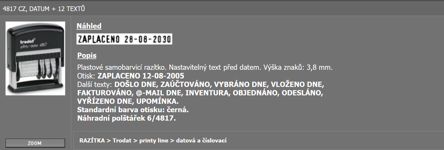 Obměna sortimentu výrobků patří k životu. Trodat nyní končí s výrobou razítka Computer 4822, proto již dále nebude v naší nabídce. Bez problému jej však nahradí TRODAT Dater 4817, kde jsou texty doplněné i o možnost tisku data.